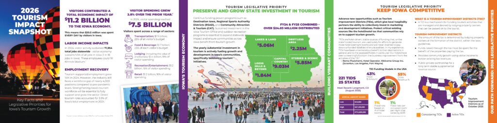 Advocating for Iowa’s travel and tourism industry—and the diverse sectors connected to our visitor economy—is a core mission of iTIP. We actively work to strengthen relationships and highlight tourism’s vital role with the Governor’s Administration, Iowa Economic Development Authority (IEDA), elected officials, state agencies, and industry stakeholders.