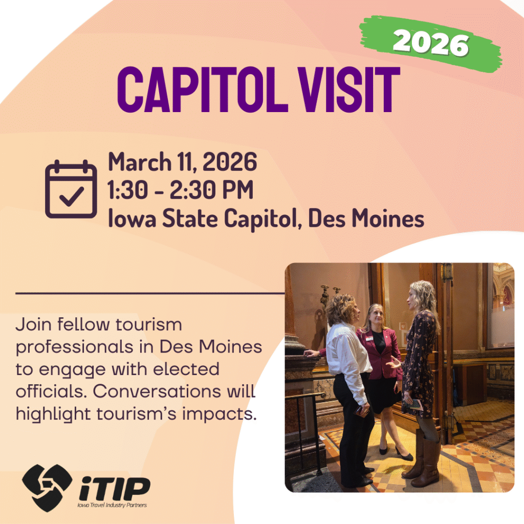 Make your voice heard at the Iowa Capitol on March 11, 2026 from 1:30 to 2:30 PM, one day ahead of the Iowa Tourism Conference. Capitol Visits allow tourism professionals to share real world stories with legislators and highlight tourism’s economic impact. These conversations help build relationships that influence policy decisions throughout the session.