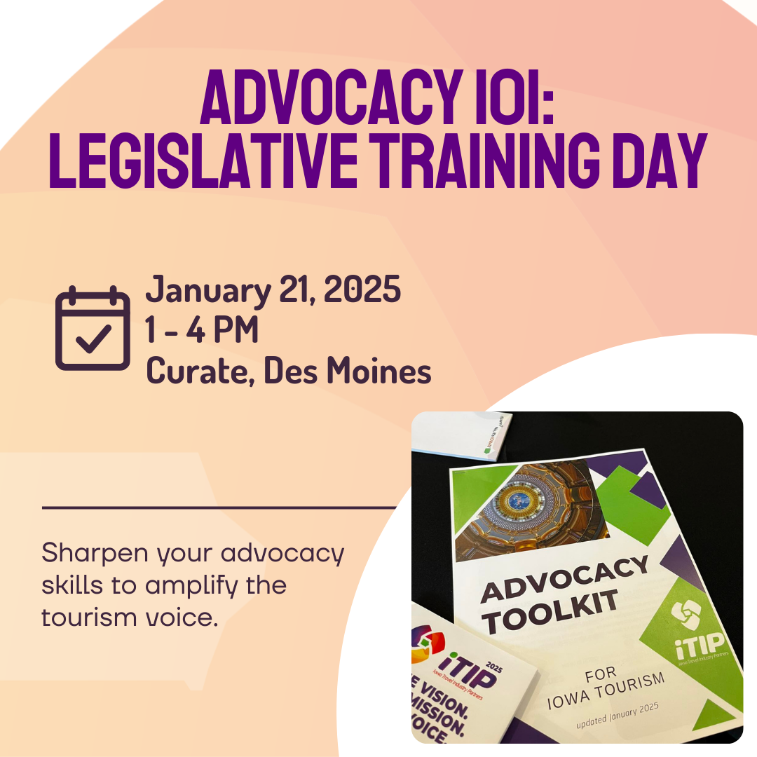 Join us for an informative and engaging event designed exclusively for tourism professionals eager to navigate the complex legislative world. This event is your opportunity to gain invaluable insights into legislative priorities and develop the skills needed to advocate effectively for your sector, before the Iowa Tourism Night legislative reception.  Event Highlights: How-to Training for […]
