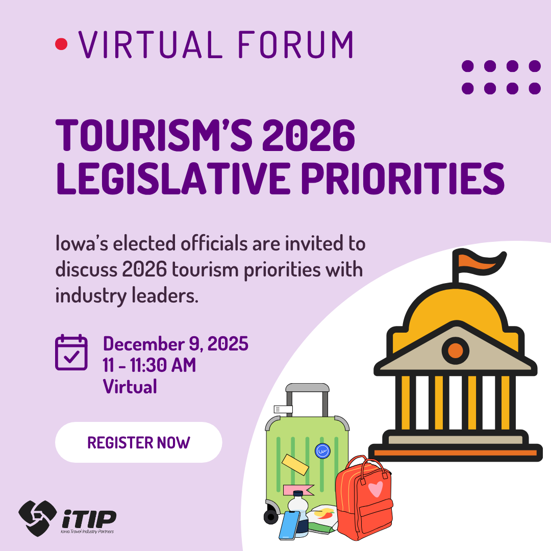 Join iTIP’s lobbyist, David Adelman of Cornerstone Government Affairs, for an insider’s look at what’s ahead in the 2026 Iowa Legislative Session. This session will highlight the tourism industry’s top priorities, anticipated policy discussions, and key issues shaping the year ahead. Gain valuable insights into emerging legislative trends and challenges that could impact your organization […]